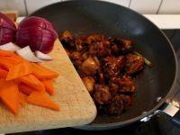12.将火略调大些,下洋葱和胡萝卜翻炒。