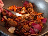 注:这儿边倒边翻炒,观察颜色足够就要停止,就是说不一定将混合酱油全部用完,如果不够可以再加,倒多了就不好补救。