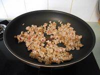 3.烧热锅倒入适量橄榄油,放入腌好的肉沫大火翻炒。