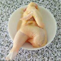 2.三黄鸡剁成块,加入一勺鲍鱼汁,一勺酱油提前腌制1到2个小时。
