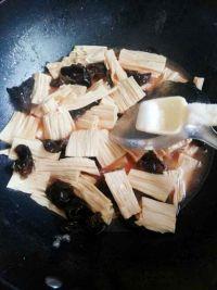 5.热锅倒油,放大蒜籽煸香,放腐竹木耳翻炒片刻