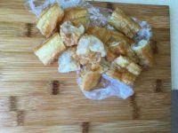 5.油条剪成4CM,也就是不管怎么着吧,油条比莲藕短一点点就行,不要碰到水,案板上有水,而我的油条已经很软了所以放袋子上