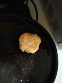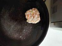 9.热电饼档加热,放色拉油,取一撮虾泥,沾满面包糠,放入电饼档,按扁,煎至焦黄后翻面。