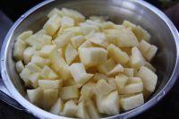 3.将苹果皮放入耐酸的锅中加入水,中火煮到果皮变白,汁略呈红色时即可取出苹果皮,将苹果丁与柠檬汁一起放入锅中,中火煮滚