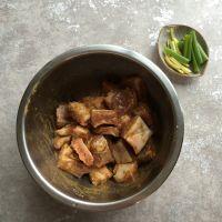 2.将浸泡过的肋排洗净后,沥干水分。放入1茶勺盐、2汤勺蚝油、3汤勺沙茶酱、少许料酒拌匀。